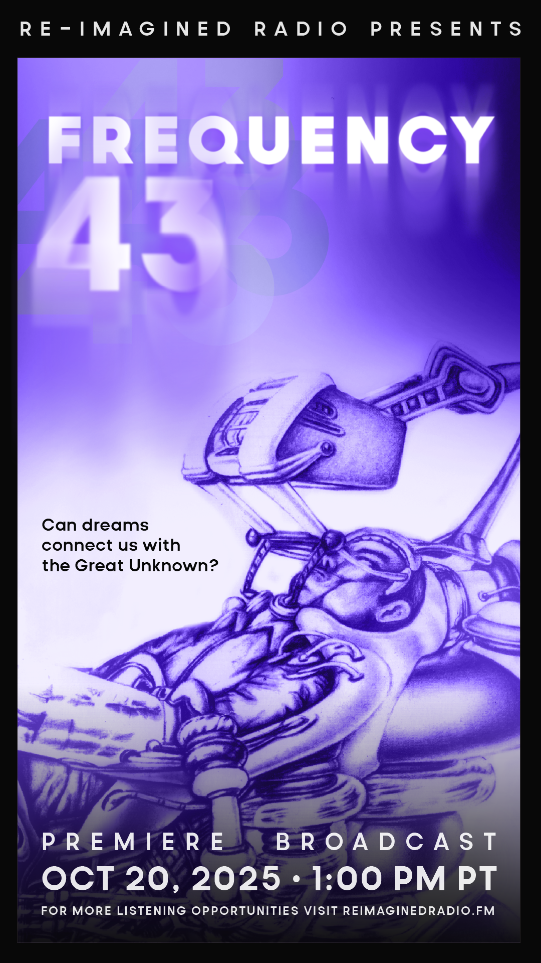 In a parallel universe, is connection with the Great Unknown possible through dreams? If so, how much of that giant universe would we truly want to contact? Answers are hinted in "Frequency 43," an original radio story by Jerrel McQuen and Marc Rose, first broadcast in 1980. Now re-titled. Re-booted. Re-wrapped in trademark cinematic sound. Re-broadcast by Re-Imagined Radio.