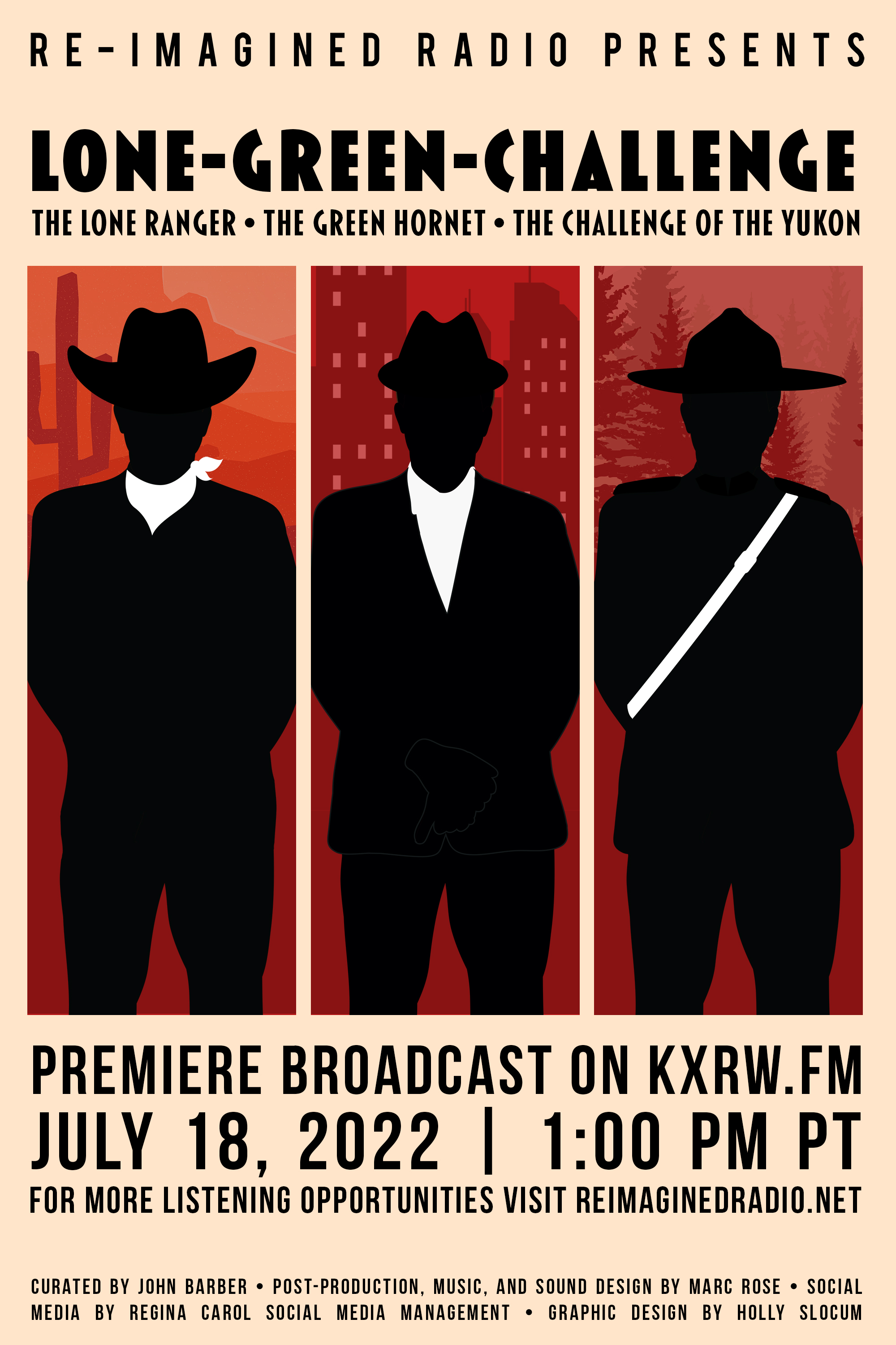Re-Imagined Radio pays tribute to three uniquely connected radio drama series, The Lone Ranger, The Green Hornet, and The Challenge of the Yukon. Each are examples of pioneering radio storytelling.